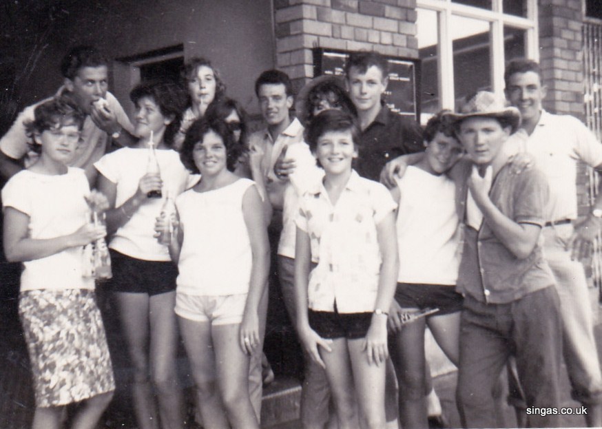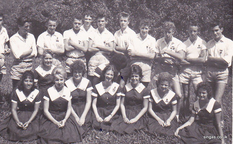 on names. Here are those I know: After the half out lad is me, Jim Parker, then Alan Smith the fifth Dave Carr, then third from the right is John McLoughlin. Girls: The fifth (and more or less central) figure is Valmay Gascoigne (now Young) who told me she