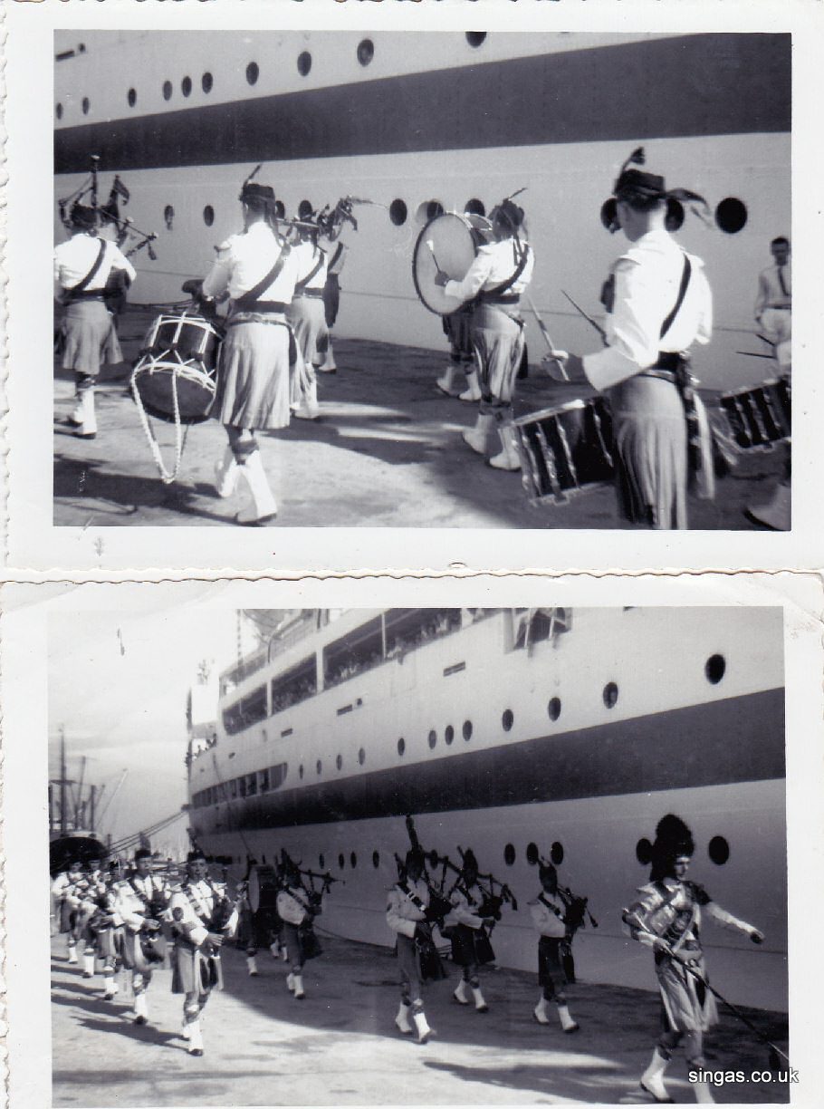 Two pictures of the RAF Pipe Band seeing off the Navasa |