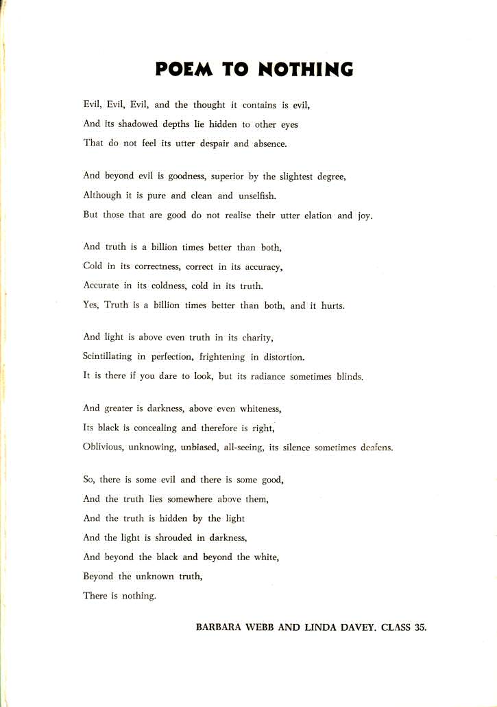 ![]() Page 19 Poem To Nothing. Barbara Webb and Linda Davey. Class 35 |
