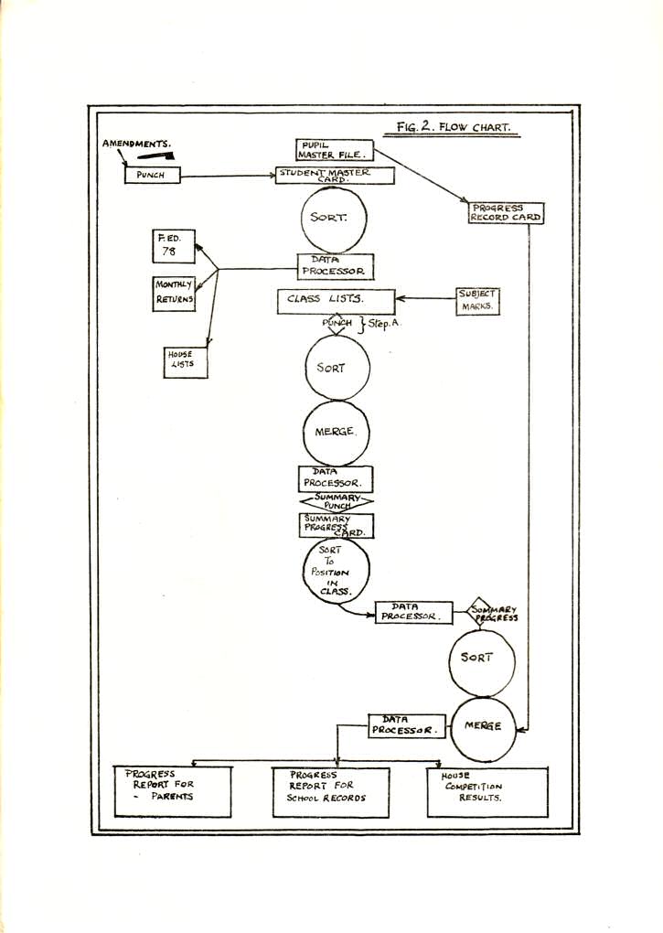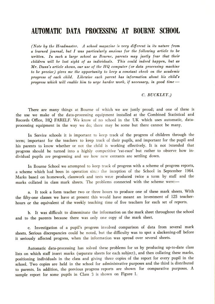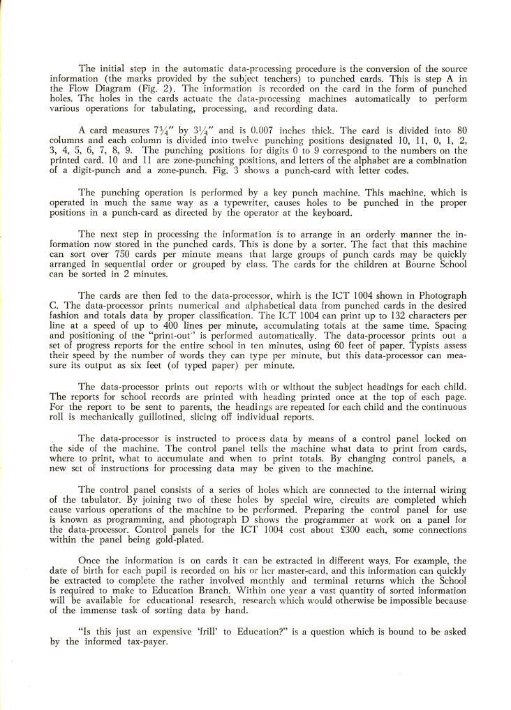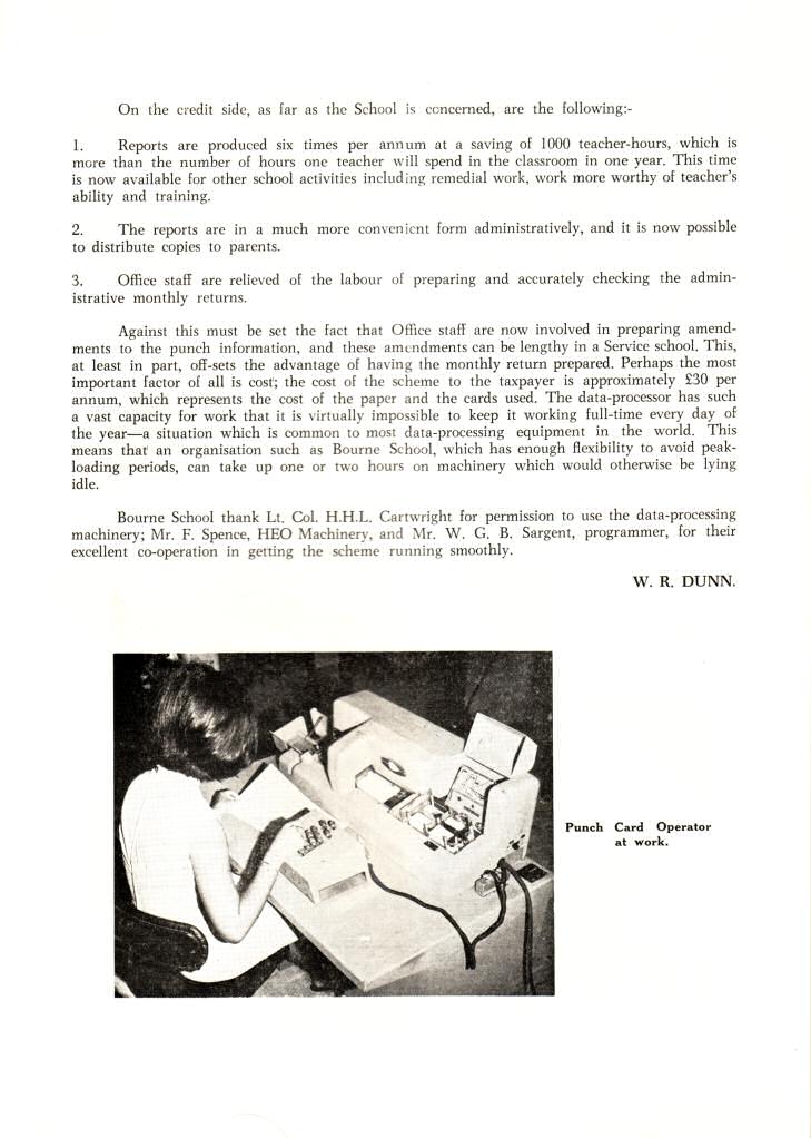 ![]() Page 32 Automatic Data Processing at Bourne School The next 5 pages is an article by Mr. W.R. Dunn. on student records at Bourne School. |