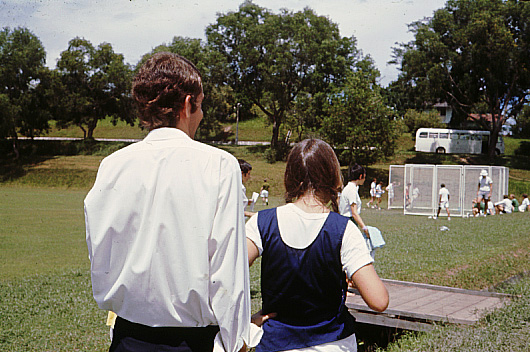 Bob Simons and Eve Stratford watching the St. John's Sports Day events held at Dover Road in 1969.