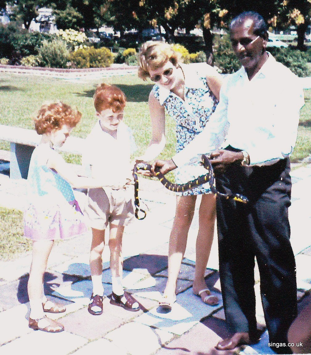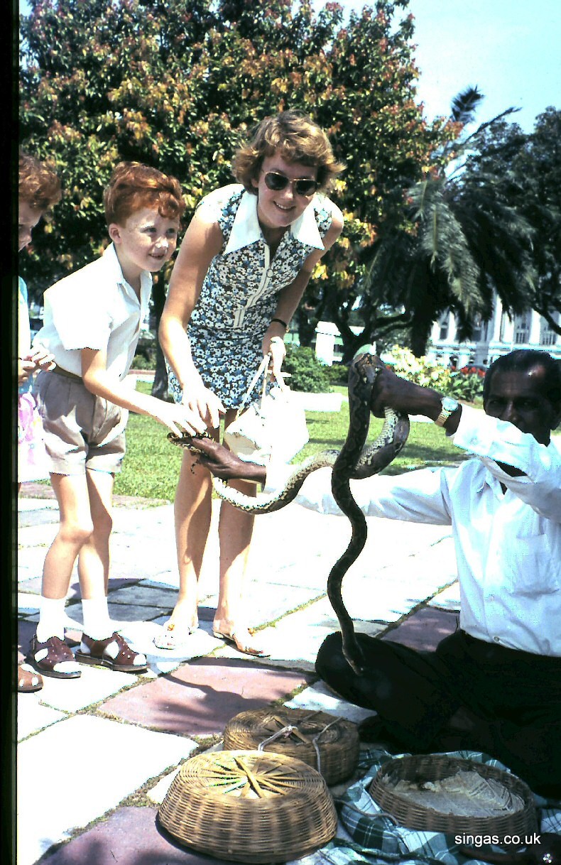 1969 Singapore. Kevin & Marje with snake handler. |
